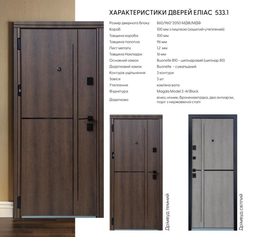Двері вхідні металеві мдф/мдф Еліас 533.1 дрімвуд темний /дрімвуд світлий