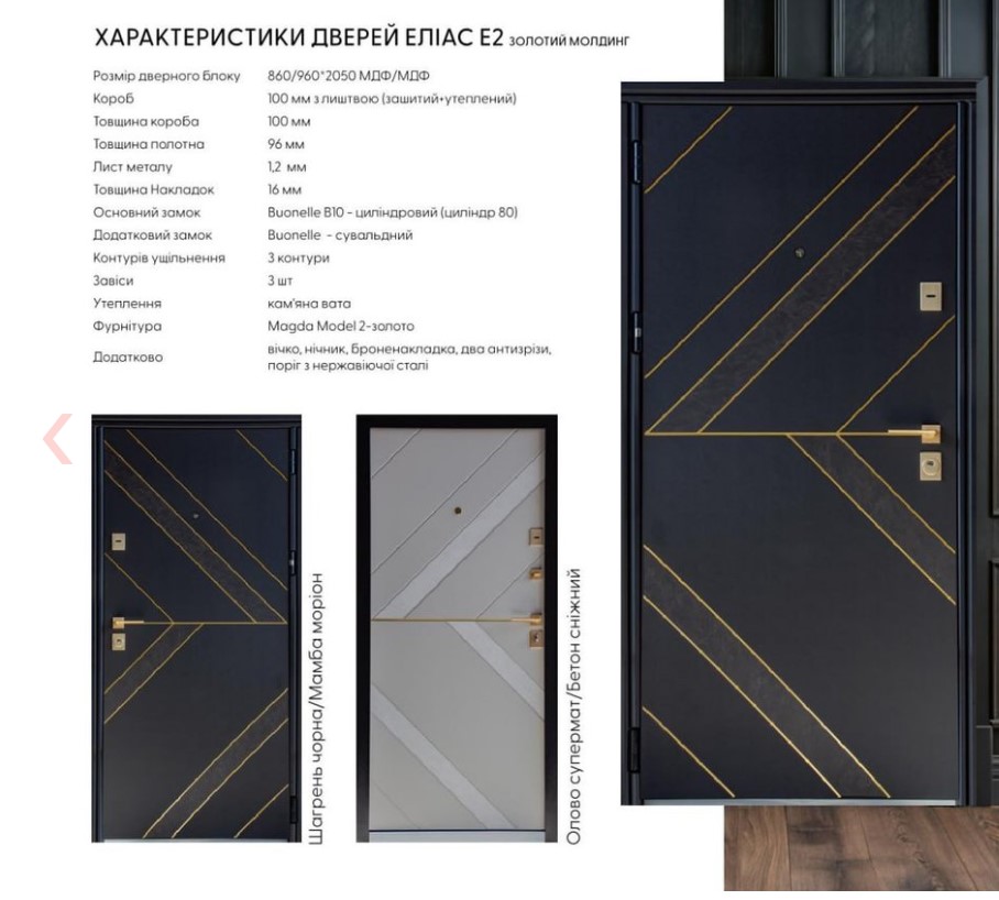 Двері вхідні металеві мдф/мдф Еліас Е2 чорна/моріон /олово мол.золото
