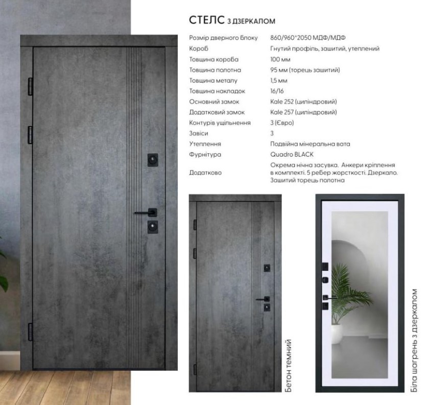Двері вхідні металеві мдф/мдф Меджік Стелс дзеркало бетон темний /біла шагрень
