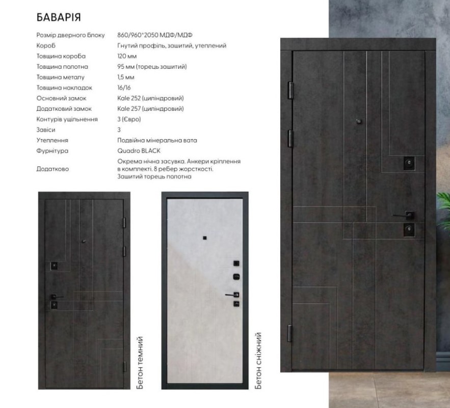 Двері вхідні металеві мдф/мдф Меджік Баварія бетон темний /бетон сніжний